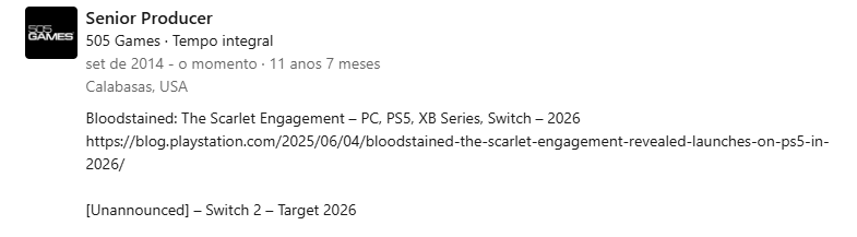 Anunciado na State of Play de 2025, “Bloodstained: The Scarlet Engagement” é a Sequência de “Bloodstained: Ritual of The Night”, se passando 200 anos antes dos eventos do jogo anterior, acompanhamos a história dos protagonistas: “Leonard Brandon” e “Alex Kyteler” embarcando em uma jornada pela Inglaterra no sombrio Castelo Etéreo, comandado pelo suposto antagonista: “Senhor dos Demônios Elias”. O jogo está previsto para ser lançado em 2026, para as plataformas: Playstation 5, Xbox Series e PC.