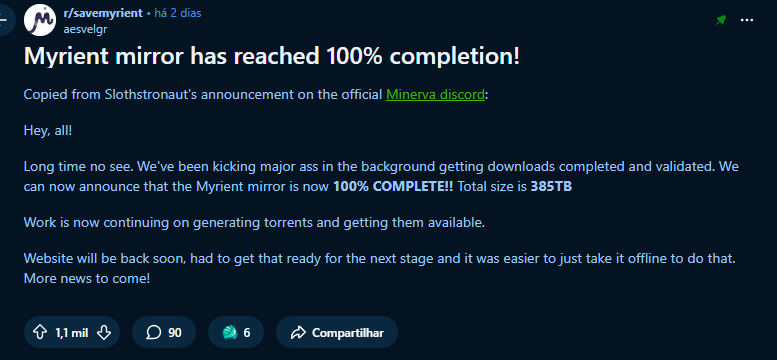 No final de fevereiro, foi anunciado nas redes sociais que o site Myrient, teria suas atividades encerradas no dia 31 de Março de 2026. No entanto, essa semana, a comunidade conseguiu completar 100% do trabalho de preservação de dados do site.