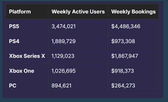O Xbox Series X aparece com aproximadamente 1,1 milhão de jogadores ativos por semana, seguido de perto pelo Xbox One, que registra pouco mais de 1 milhão de usuários semanais.